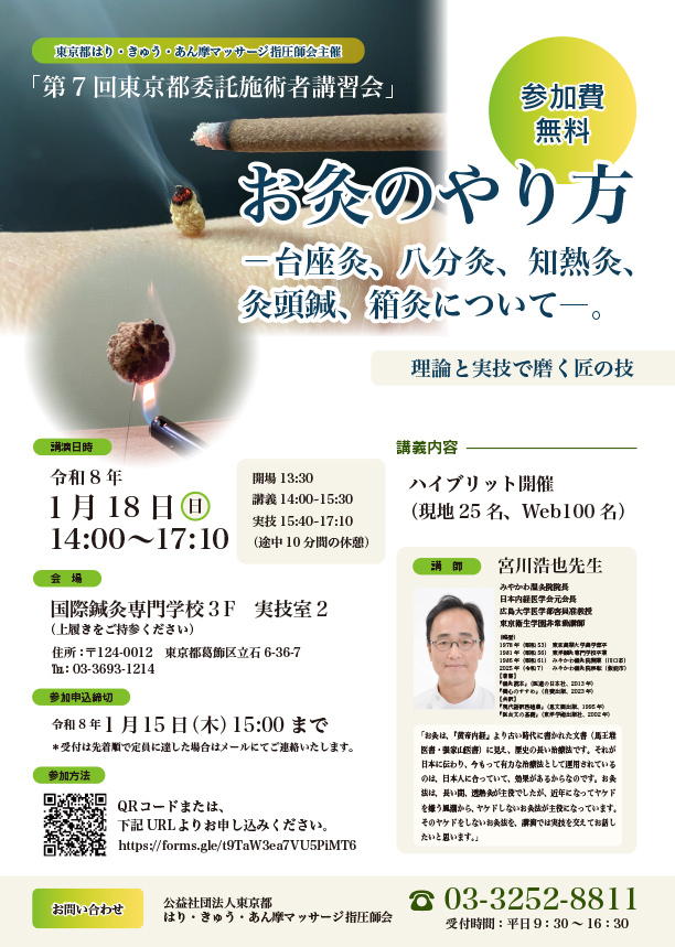 令和7年度第7回東京都委託施術者講習会「お灸のやり方ー台座灸、八分灸、知熱灸、九頭鍼、箱灸についてー」